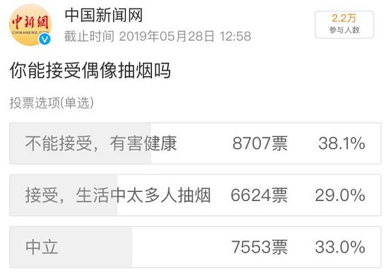 在中国新闻网官方微博发起的一项“你能接受偶像抽烟吗”的问卷中,共有2.2万人参与。