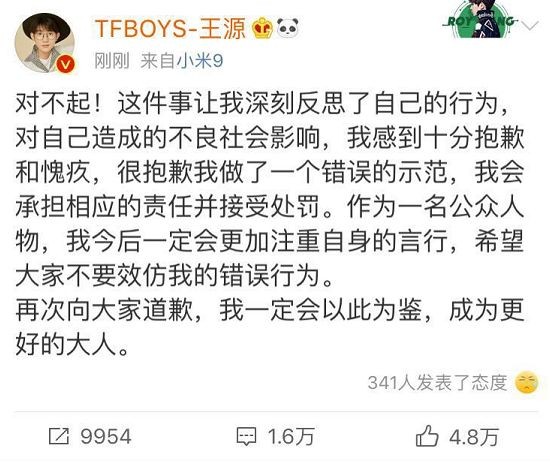 该事件在网络发酵后,王源发布致歉声明,称“感到十分抱歉和愧疚,会承担相应的责任并接受处罚。”并称“一定会以此为鉴,成为更好的大人。”