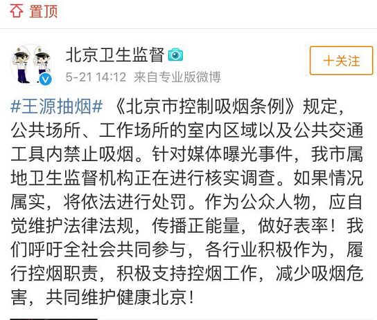 北京市控烟协会会长张建枢接受媒体采访时表示,该行为违反了北京市控烟条例,且公共人物应该注意社会影响,希望王源能够主动公开道歉。
