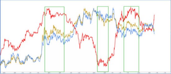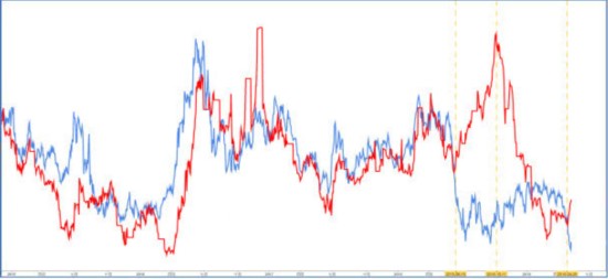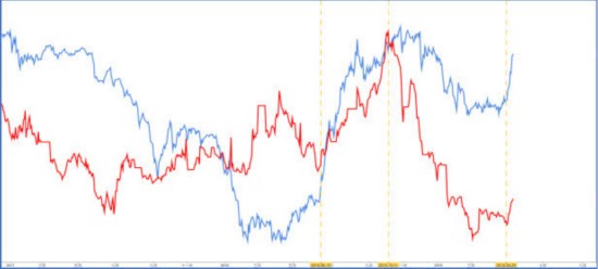 图1:2015年至今国内豆粕期货主连(红色)与美豆CBOT(蓝色)走势对比