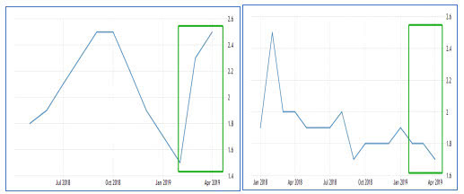 我国农产品的价格与国民生活息息相关,近年来我国多种农产品价格攀升(主要体现在水果和蔬菜),这直接致国民消费能力下降,价格上涨带来的消费上行在4月格外突出。观察2015年至今的国内股市,目前仍处于3000点以下相对低位;伴之2019年2至4月我国CPI由1%水平跃至2%上方,在当下人民币对外汇率趋下行的现状下,国内物价却表现上行态势,由此产生的问题值得深思。