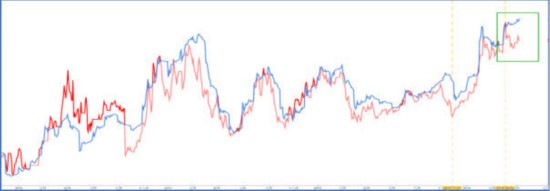 图4:2016年至今国内铁矿石期货主连(红色)与国际铁矿期货(蓝色)走势对比