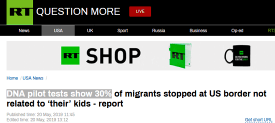 本月早些时候,美墨边境一些被捕移民和他们的家人接受了DNA检测。“今日俄罗斯”(RT)20日报道了此次检测的惊人结果:30%的受检人都与其声称 “自己孩子”的儿童没有任何血缘关系。