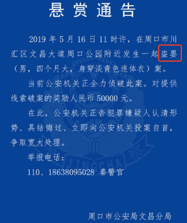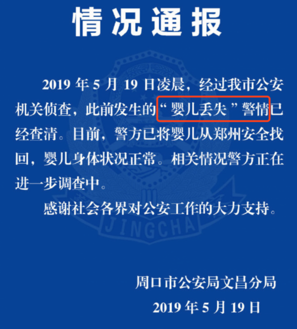 时间回溯到5月16日,当天,河南周口市公安局发布一则警情通报称,16日11时45分,周口文昌分局接到群众朱某报警称,其妻子带着四个月大的男孩子在周口市川汇区文昌大道周口公园对面绿化带中间小路上散步时晕倒(患有低血钾病,有晕倒史),醒后发现孩子失踪,警方立案调查。
