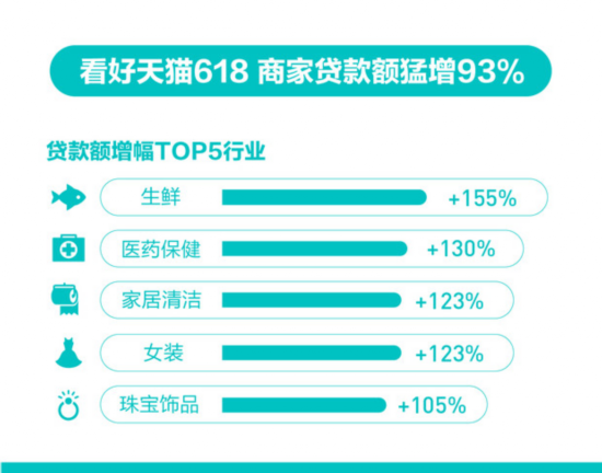 网商银行披露的最新数据显示:4月1日以来,天猫和淘宝平台上卖家的贷款额同比去年猛增93%,生鲜、医药保健行业、女装、家具清洁、珠宝饰品等行业的贷款额增幅都超过100%。