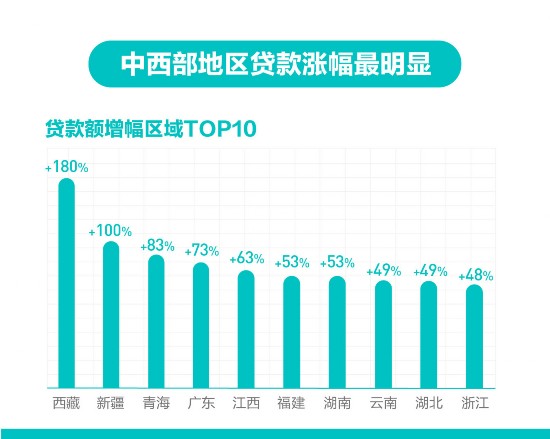 据悉,发货地在西藏、新疆、青海的商家贷款涨幅最快,分别上涨了为180%、100%、83%,这说明中西部下沉地区的经济正呈现出活跃态势,释放巨大潜力。