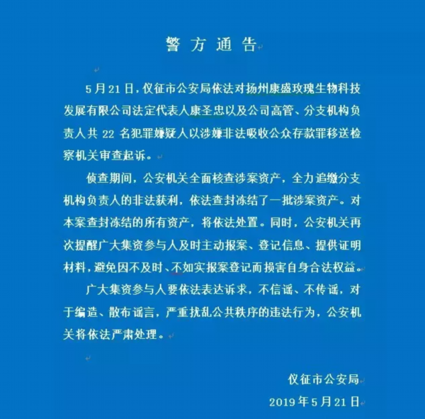5月21日,仪征市公安局依法对扬州康盛玫瑰生物科技发展有限公司法定代表人康圣忠以及公司高管、分支机构负责人共22名犯罪嫌疑人以涉嫌非法吸收公众存款罪移送检察机关审查起诉。