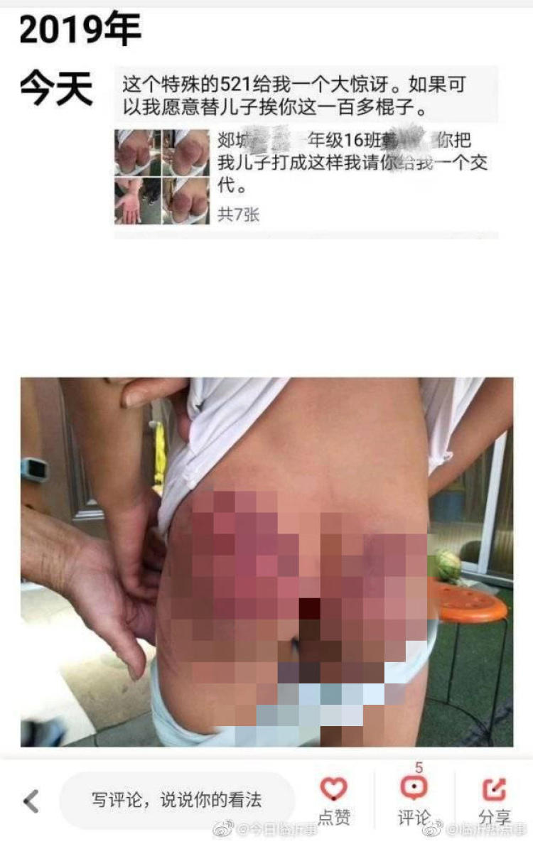 有网友爆料称,5月21日,山东省临沂市郯城县郯城二小老师韩某在学校教室,将一名一年级16班的学生打了一百多棍,被打学生臀部出现大片红肿。