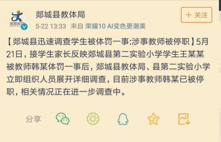 5月22日下午,郯城县教体局通过官方微博发布消息称,目前涉事教师韩某已被停职,相关情况正在进一步调查中。