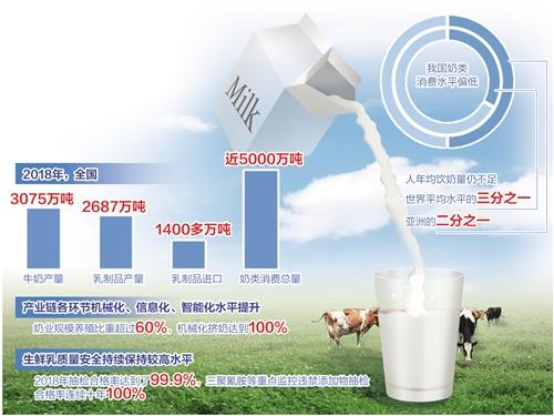 “2018年,全国牛奶产量3075万吨、乳制品产量2687万吨、乳制品进口1400多万吨、奶类消费总量接近5000万吨,数量上中国已是名副其实的奶类生产、加工、进口和消费大国。”中国奶业协会副会长兼秘书长刘亚清表示,我国奶业规模养殖比重超过60%,全混合日粮饲喂比重超过80%,机械化挤奶达到100%,产业链各环节机械化、信息化、智能化水平提升。