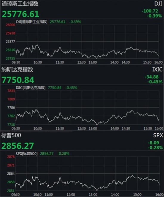 截至收盘,道琼斯工业平均指数收跌100.72点,跌幅0.39%,报25776.61点。纳斯达克综合指数收跌34.88点,跌幅0.45%,报7750.84点。标普500指数收跌8.09点,跌幅0.28%,报2856.27点。
