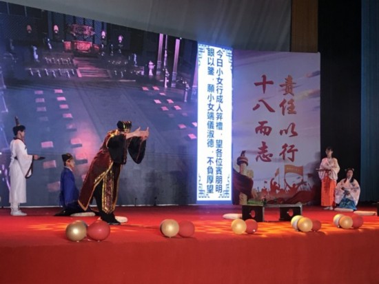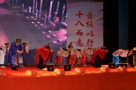 活动在汉服表演舞蹈《礼仪之邦》中拉开帷幕,在亲子互动环节,现场播放学生想对家长说的一些话,同时学生家长相互交换信件礼物等。在冠笄礼展示环节,部分学生和家长身着汉代服装,对即将成年的男女行加冠和行笄礼,并庄重宣读了成人礼誓词。