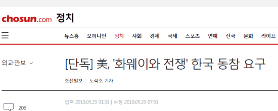 《朝鲜日报》23日早些时候的报道援引首尔外交人士的消息称,美国政府通过外交渠道,向韩国政府传达“使用华为产品,会出现安全问题之忧”的信息,并要求作为同盟国的韩国,积极协助美国的对华政策。报道称,美国对华贸易施压以及对华为实施全面限制后,还要求韩国等同盟国也加入对华为之战。