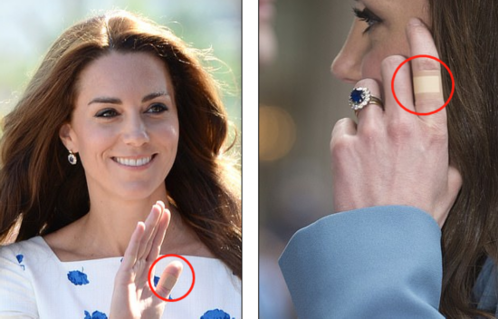 2016年2月,凯特王妃被拍到左手食指和右手拇指缠着创可贴。(图源:每日邮报)