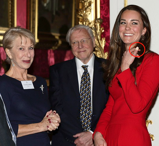 2014年2月,戏剧艺术招待会上的凯特王妃左手拇指缠着创可贴。(图源:每日邮报)