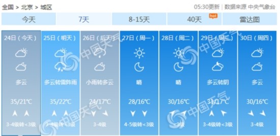 中国天气网讯 昨天(23日),北京迎来今年首个高温日,今天气温依然“热情”不减,预计白天的最高气温还将达到35℃,公众外出需注意防暑防晒及补水润燥。