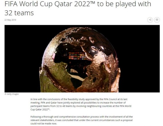 国际足联官方宣布2022年世界杯决赛圈依然保留32支球队名额。 图片来源:国际足联官网截图
