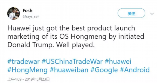 ▲“华为已get了发布鸿蒙系统的最佳产品营销——由特朗普为它带盐!干得漂亮!”