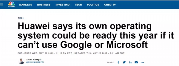 “今天,我们华为仍然致力于(使用)微软Windows和谷歌Android。但如果无法再使用它们,华为将准备实行B计划——使用我们自己的操作系统。”华为消费者业务总裁余承东告诉CNBC。