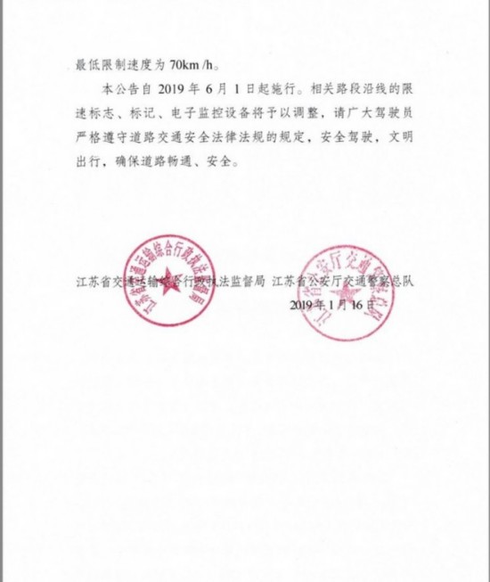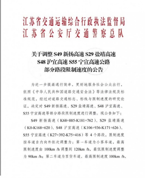 2019年1月16日,省交通运输综合行政执法监督局和省公安厅交警总队联合发布:为进一步提高通行效率,让群众出行更加便捷舒适、经济高效,自2019年6月1日起,对S49新扬高速、S29盐靖高速、S48沪宜高速、S55宁宣高速这4条高速公路部分路段限制速度进行调整。