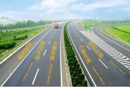 第一车道为小客车道,最高限制速度由100km/h调整到120km/h,最低限制速度为90km/h;第二车道为客货车道,最高限制速度100km/h,最低限制速度为70km/h。