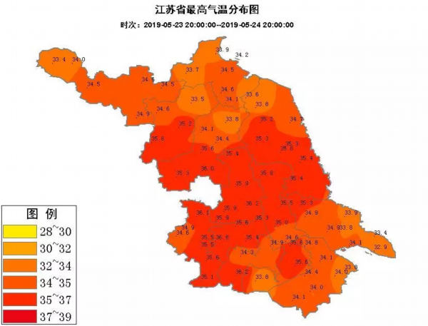 这是昨天全省的最高气温分布图,都在30℃以上,近一半地区在35℃以上,最高气温出现在句容,36.6℃。