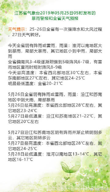 25-26日全省有一次强降水和大风过程,27日天气转好。今天全省阴有阵雨或雷雨,雨量:淮河以南地区大到暴雨,局部大暴雨,其它地区小到中雨,局部大雨;全省偏南风3-4级逐渐增强到5级阵风6-7级,有雷雨地区雷雨时短时阵风8-9级;今天最高温度:本省西北部地区30℃左右,本省东南部地区27℃左右,其它地区24-25℃,明晨最低温度:全省20-21℃。