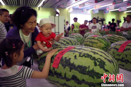 5月25日,第31届北京大兴西瓜节“美丹杯”全国西甜瓜擂台赛在大兴区庞各庄镇举办。图为观众们围观“瓜王”。 杜燕 摄