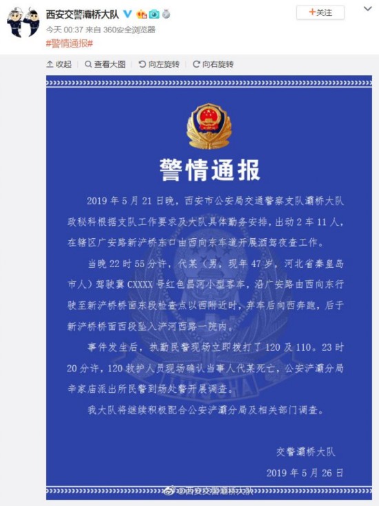 5月26日,交警灞桥大队发布警情通报称,将继续积极配合公安浐灞分局及相关部门调查。