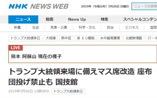 26日傍晚,赴日访问的美国总统特朗普将与日本首相安倍晋三一起,在东京的国技馆观看大相扑比赛的决赛。为迎接特朗普,日本相扑协会在国技馆做出一系列改变,包括靠近赛场的“升席”改为更为舒适的沙发,并且给所有观众发放呼吁“禁止扔坐垫”的传单等,被日媒称为“极罕见”。