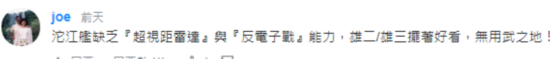 “少膨风(吹牛)了,还没接近航母,早就被打挂了!”岛内网友对蔡英文如此自吹自擂一片唱衰,有网友酸道,蔡英文一席话犹如”玩具总动员,玩具兵总动员“,还有网友直指,”沱江舰“缺乏”超视距雷达和反电子战能力,而(台当局一直吹捧的)雄二雄三只摆着好看,毫无用武之地“↓