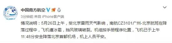 5月26日上午,受北京雷雨天气影响,南航CZ3101广州-北京航班在降落过程中,飞机遭冰雹袭击,挡风玻璃破裂。机组按手册程序处置,飞机已于上午11:48分安全降落北京首都机场,机上人员平安。