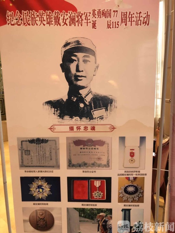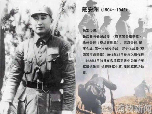 戴安澜(1904年11月25日—1942年5月26日)安徽省无为县人,国军名将,黄埔系骨干之一。1926年黄埔军校三期毕业。1939年6月17日,授陆军少将。 1942年,率第200师作为中国远征军的先头部队赴缅参战。取得同古会战(歼敌五千余,而日军兵力4倍于戴部)、收复棠吉等战功。1942年5月18日在郎科地区指挥突围战斗中负重伤,26日下午5时40分在缅北茅邦村殉国。1942年10月16日,追赠陆军中将,解放后追认为革命烈士。