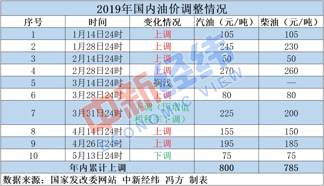 今年以来,国内成品油价已经历10次调整,呈现7涨2跌1搁浅格局。其中,9次是按照“十个工作日”原则进行调整,1次是因增值税税率下调而进行调整。截至目前,年内汽油价格已累计上调800元/吨,柴油价格已累计上调785元/吨。如果此次上调预期兑现,2019年国内成品油价将第八次上调。