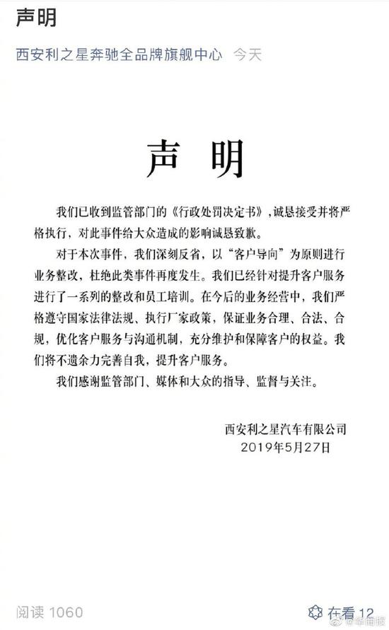 随后西安利之星发表声明,诚恳接受并将严格执行处罚决定,对此事件给大众造成的影响诚恳致歉。并表示针对提升客户服务进行了一系列的整改和员工培训,在今后的业务经营中会严格遵守国家法律法规、执行厂家政策,保证业务合理、合法、合规,优化客户服务与沟通机制,充分维护和保障客户的权益。