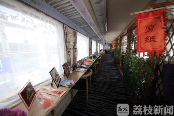值得关注的是,旅游列车配备了书吧、茶吧等休闲游乐场所。而且,“环西部火车游”列车根据不同车厢主题,将西北旅游的地域特色、历史人文、民俗风情等多元素有机融合,把特色元素装饰画融入车厢,勾勒出一幅“人在车上,车在画中”的美丽景观,使列车开成了荟萃陇原、丝路文化的流动博物馆。