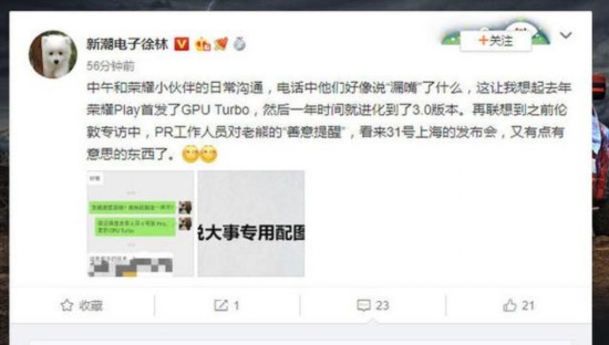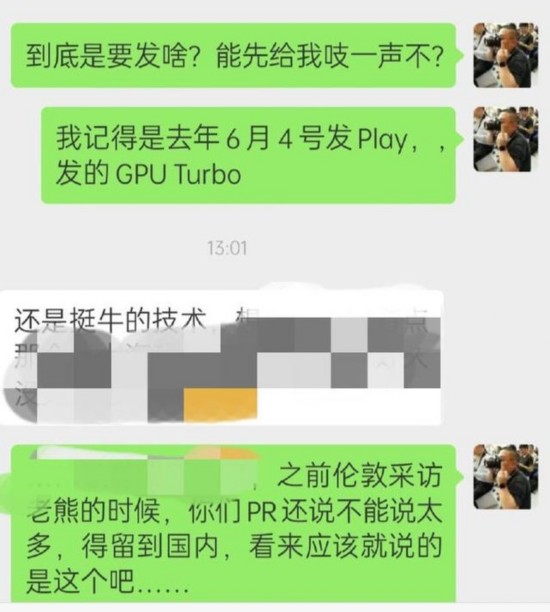徐林在微博中透露和荣耀方面的沟通记录,荣耀方面透露了荣耀20系列有一项”挺牛的技术“,而聊天记录中也提及到去年荣耀手机上的GPU Turbo技术以及荣耀业务部副总裁(产品)熊军民在专访中的”善意提醒“,估计荣耀20系列上的新技术与性能提升有关,或许是和系统方面的优化。