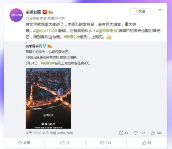 晚些时候,荣耀业务部副总裁(产品)熊军民也在微博中透露了本周五荣耀国内发布会将会有”巨大惊喜“。在荣耀20系列伦敦发布会后专访中,熊军民还想透露更多关于荣耀20系列的信息,但被当场制止了,现在徐林和熊军民同时发布关于荣耀20系列国内发布会有”大招“的微博,看来荣耀20系列在伦敦发布会上有所保留,国内发布会必定有更大的惊喜。