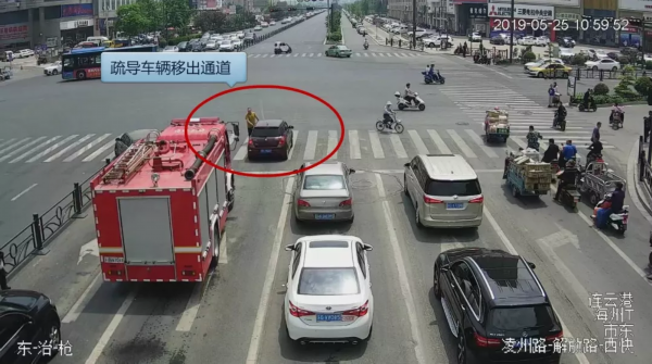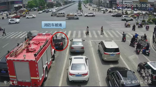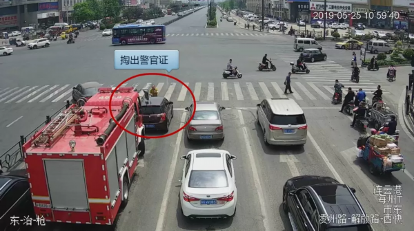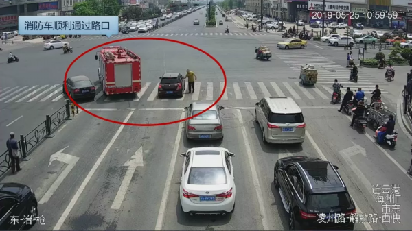 5月25日中午,在连云港市区就发生了这样一幕,恰巧在旁边的连云港市公安局民警许乾乾看到了此情况,他二话没说下车掏出了警官证,引导前方车辆靠边停靠,及时为消防车挪出了“生命通道”。