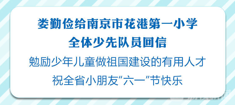 荔枝新闻讯 “六一”国际儿童节前夕,江苏省委书记娄勤俭给南京市花港第一小学全体少先队员回信,对他们提出殷切希望,勉励孩子们把五彩斑斓的“小梦想”汇入民族复兴的“大梦想”,长大后成为祖国建设的有用人才。