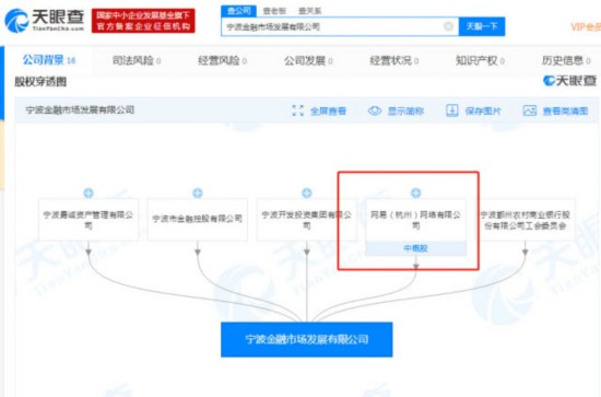 腾讯科技讯 5月28日消息,天眼查数据显示,5月22日,网易(杭州)网络有限公司新增对外投资,成立宁波金融市场发展有限公司,注册资本1.3亿人民币。