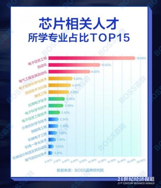 据BOSS直聘数据显示,芯片人才所学专业TOP5为电子信息工程(18.69%)、自动化(10.63%)、电气工程及其自动化(9.02%)、电子信息科学与技术(5.02%)和测控技术与仪器(4.97%)。以上五个专业主要涉及芯片设计层面。就芯片制造而言,主要对应为化工、精密仪器等专业。同时,BOSS直聘观察到,在芯片人才所学专业人数占比排名前十的专业中,并没有数学、物理等基础专业学科在列。