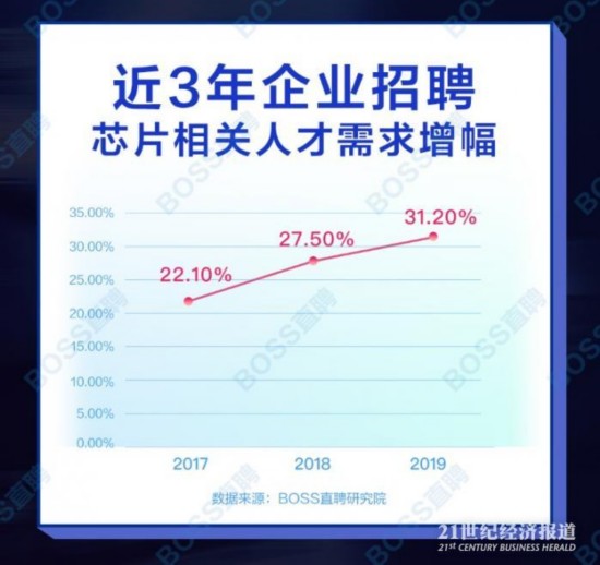 BOSS直聘近日对平台积累数据进行分析研究,对芯片人才市场现状进行探讨。研究发现,2019年芯片人才平均招聘月薪为10420元,十年工作经验人才平均招聘月薪为19550元,仅为同等工作年限的软件人才薪资的一半。电子信息工程、自动化、电气工程及其自动化为最受芯片人才青睐的三个专业,数学、物理等基础学科未在芯片人才所学专业TOP10之列。近三年企业对芯片人才需求量不断加大,到2020年,芯片人才缺口将超30万。