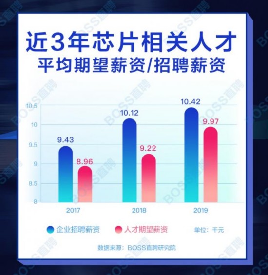 另一个值得关注的发现是,近三年来,芯片人才的平均期望薪资均低于企业实际的平均招聘薪资。多年来的低薪环境导致芯片从业人员对自身岗位薪资预期普遍偏低。近几年,随着芯片人才需求快速上涨,加之人才供应不足,使得在芯片求职者身上往往会出现“要10万,给15万”的情况。