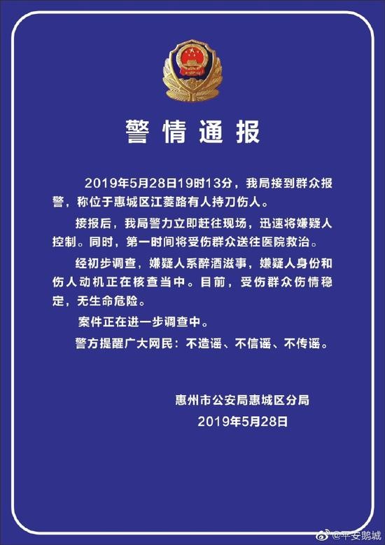 北京青年报消息 惠州惠城区公安局28日晚发通报称,5月28日19时13分,该局接到群众报警,称位于惠城区江菱路有人持刀伤人。接报后,公安局警力立即赶往现场,迅速将嫌疑人控制。同时,第一时间将受伤群众送往医院救治。经初步调查,嫌疑人系醉酒滋事,嫌疑人身份和伤人动机正在核查当中。目前,受伤群众伤情稳定,无生命危险。案件正在进一步调查中。详情》