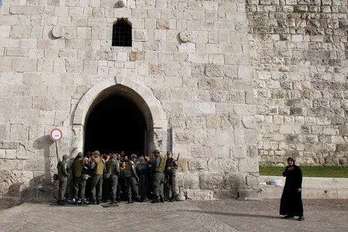 2014年5月28日,反对“耶路撒冷日”庆祝活动的巴勒斯坦人被以色列边防警察限制在耶路撒冷老城的希律门门口。新华社发(穆阿迈尔 阿瓦德摄)