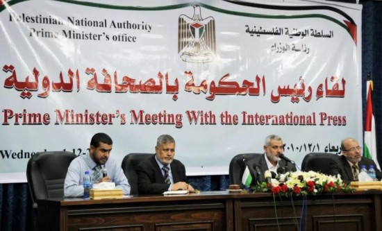 2010年12月1日,巴勒斯坦伊斯兰抵抗运动(哈马斯)高级领导人哈尼亚(右二)说,哈马斯同意以全世界巴勒斯坦人通过公投方式,来决定以1967年第三次中东战争前实际停火线为边界、以东耶路撒冷为首都建立巴勒斯坦国的方案。新华社记者 杨媛媛 摄