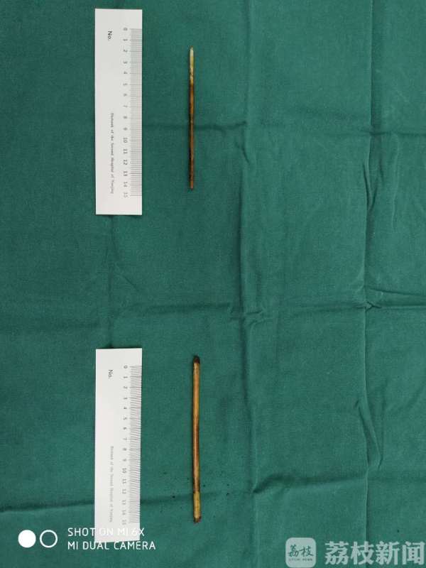 为使患者尽快摆脱危险,易永祥教授和胃肠外科博士、副主任医师王鹏冒着风险为其进行了紧张手术,术中发现异物位于胃及小肠内,小肠内钢签与周围粘连,部分肠管与腹壁粘连形成脓肿,腹直肌部分坏死约5*5*5mm,予以切除脓腔,引流,终于将两根约15cm长的钢签顺利取出。现患者术后恢复良好,不日即可出院。
