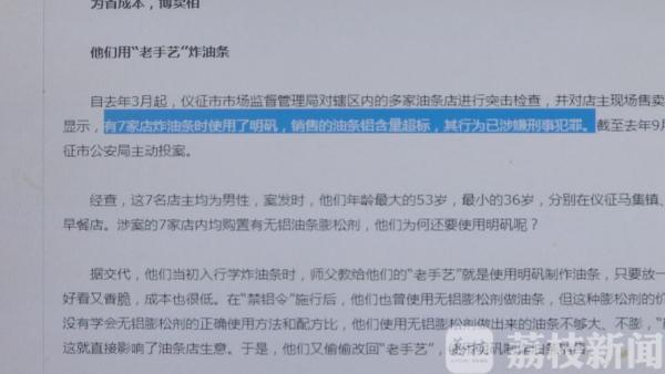 从去年开始,仪征的市场监管部门对多家油条店进行突击检查,结果查出有七家店炸油条时使用了明矾,导致销售的油条铝含量超标,其行为已涉嫌刑事犯罪,最终这七名摊主被处以万元以上罚款,并在媒体上公开道歉。紧接着,又有五名油条摊摊主因为非法添加明矾,被当地检察院提起公诉。