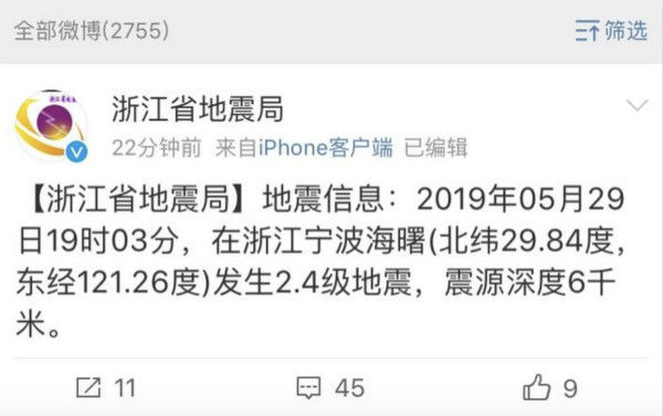浙江宁波两天内三次地震吓坏网友 地震局淡定回应